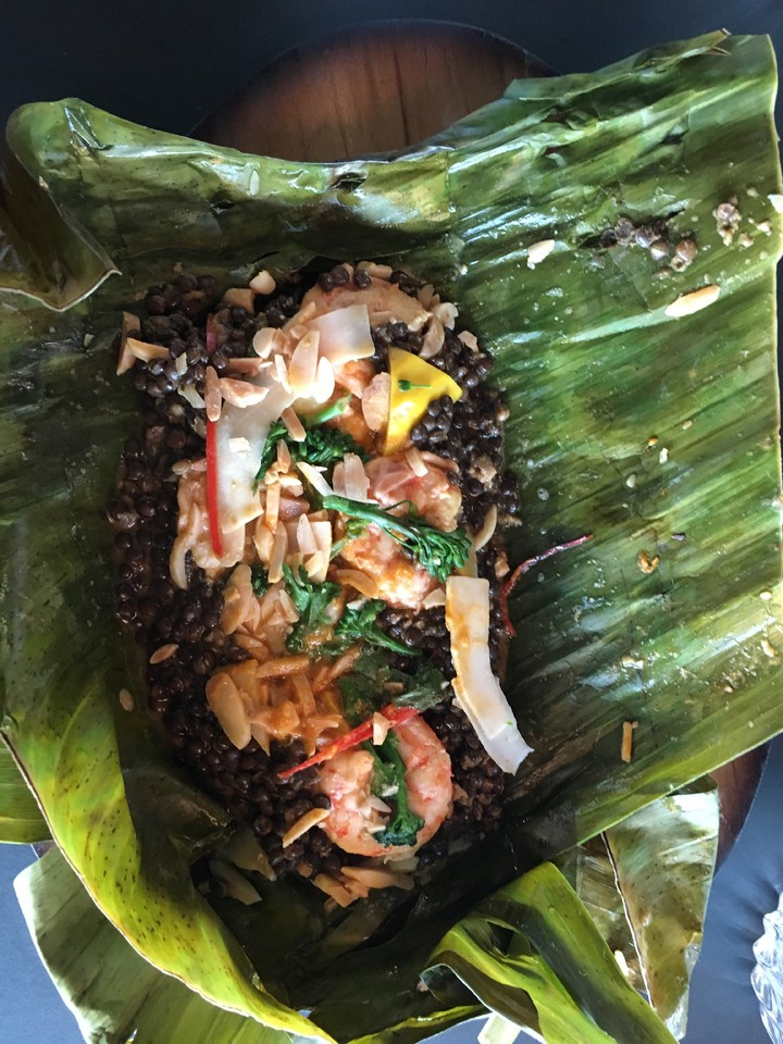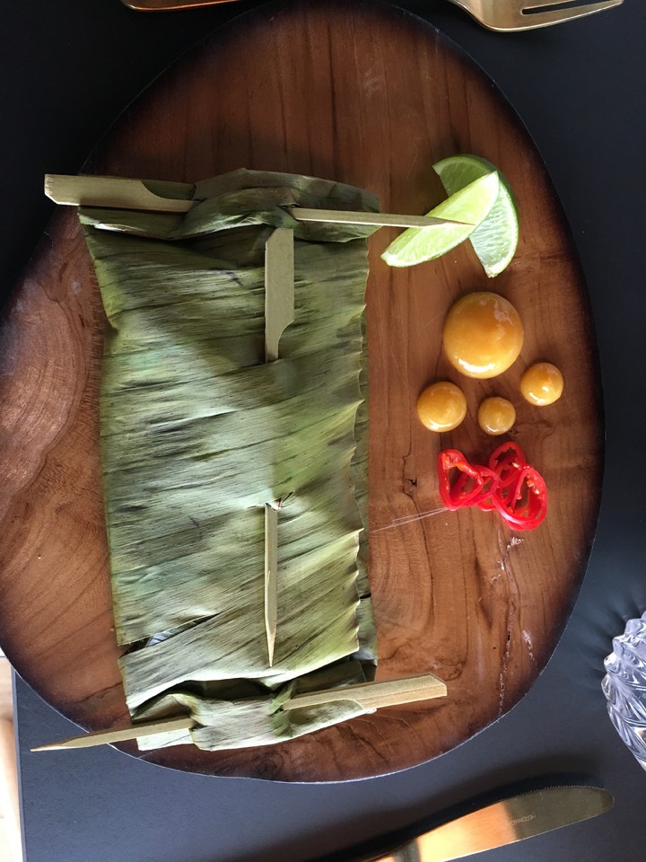 Lamentavelmente o mesmo voltou a acontecer no outro prato principal. Camarão indiano em folha de bananeira com lentilhas, malaguetas, coco e chutney de manga. Um bom prato, que pecou por alguma falta de sabor e por causa dos camarões que passaram do ponto. Um pequeno deslize que, conforme me transmitiu o Chef Kiko, será retificado.