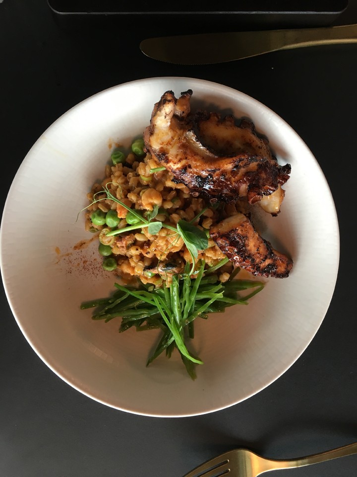Seguiu-se uma espetada de polvo galega e cevadinha com camarão, mexilhão e ervilha torta. A cevadinha estava muito boa, mas o polvo estava seco e rijo por ter passado do ponto.
