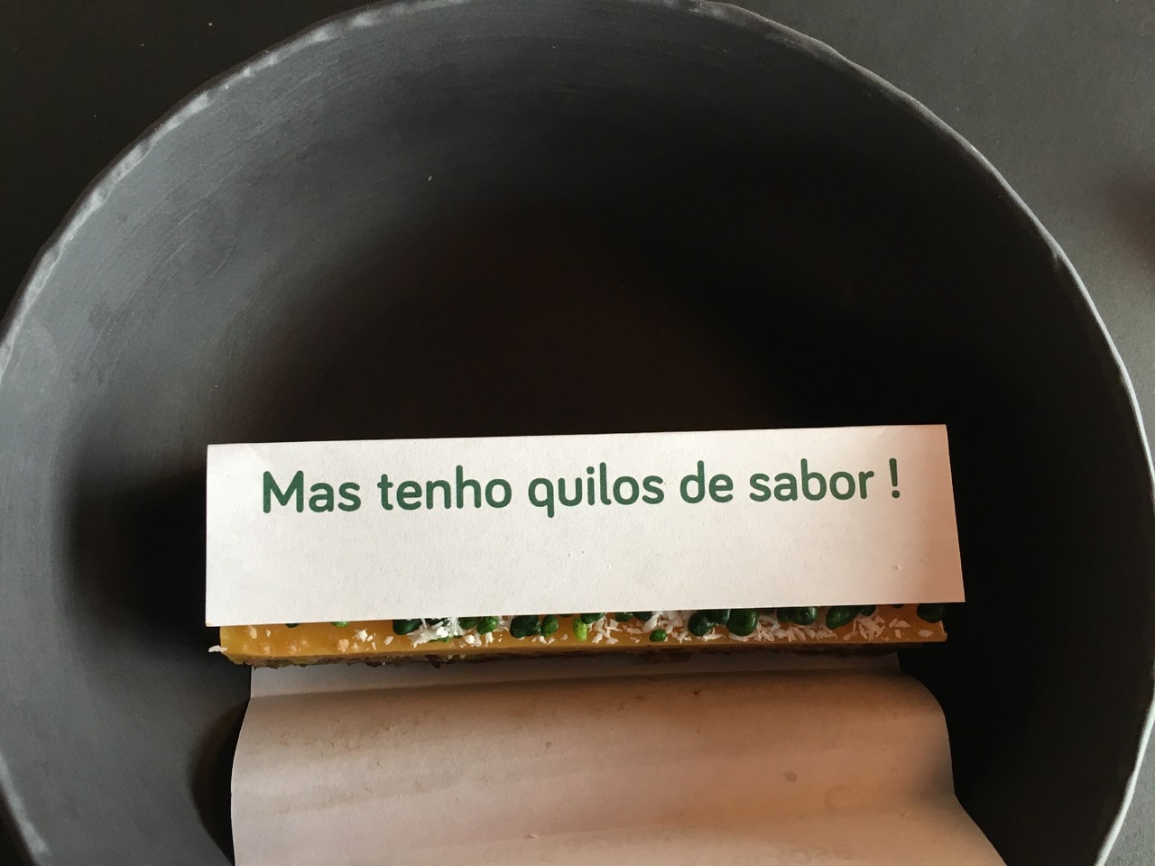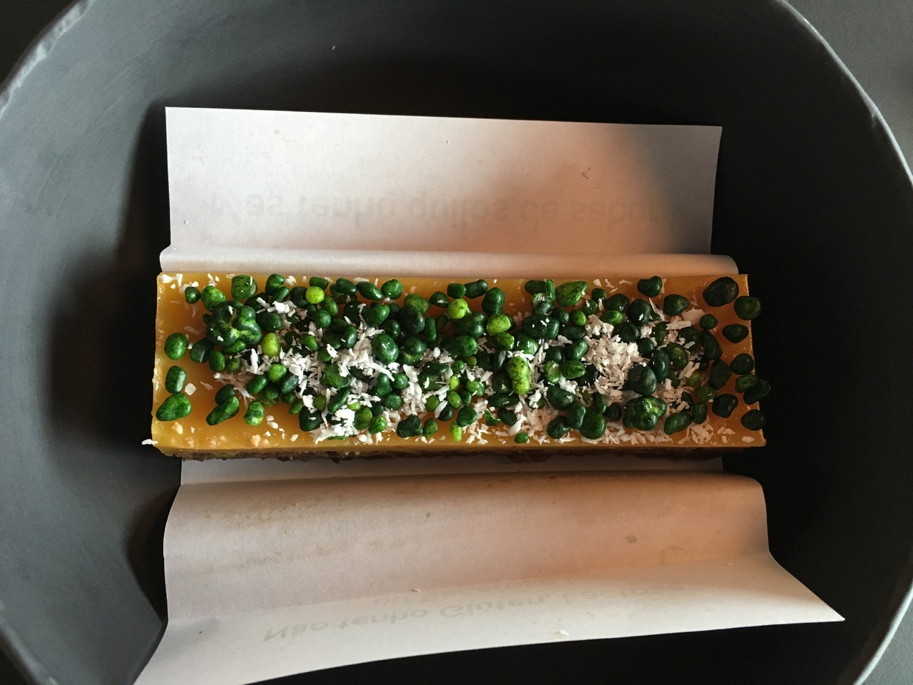 E a barra energética do Watt. Nome perfeito, tendo em conta a localização do restaurante e sua filosofia. Apresentação muito criativa. Já quanto ao sabor... No fundo, e de forma simples, sabia a uma barra energética. Tal e qual. Bem sei que é uma barra de coco com pistácio, tâmaras, togorashi, peta zetas e gelatina de laranja. Mas, no fim, o que comemos é uma barra energética. Mesma textura, mesmo sabor. É evidente que as petas zetas fazem diferença, mas duvido que alguém queira terminar uma boa refeição com uma barra energética.